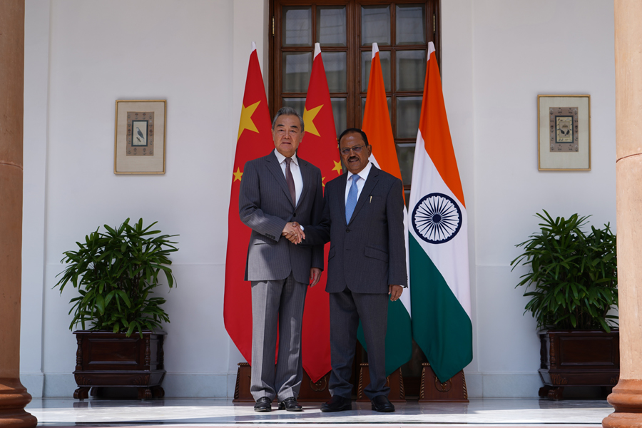 Foreign Minister Wang Yi shakes hands with Indian National Security Advisor Ajit Doval in New Delhi, the capital of India, on Tuesday. Wang is on a three-day official visit to India that began on Monday, marking his first trip to the country in over three years. CHEN DONGSHU / XINHUA