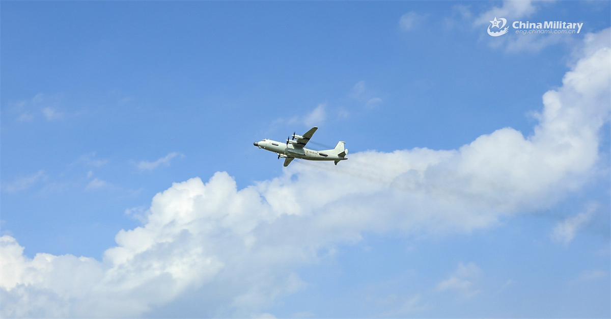 KJ-500H airborne early warning aircraft attached to an aviation unit under the Chinese PLA Navy flies to the designated area during a flight training exercise on August 4, 2025. (eng.chinamil.com.cn/Photo by Hao Yongfei)