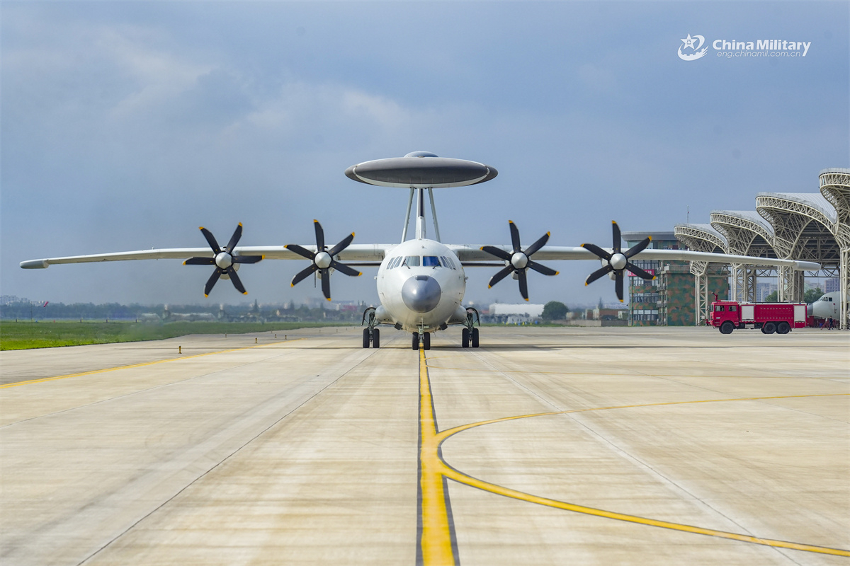 KJ-500H airborne early warning aircraft attached to an aviation unit under the Chinese PLA Navy taxis on the runway during a flight training exercise on August 4, 2025. (eng.chinamil.com.cn/Photo by Hao Yongfei)