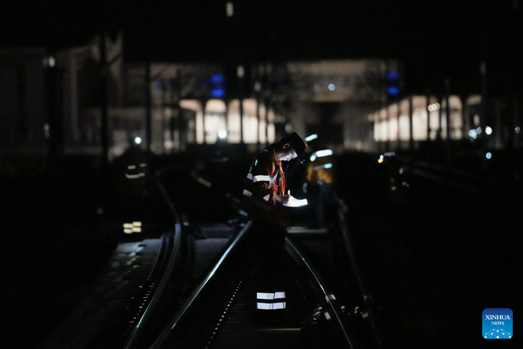 A staff member inspects the Hangzhou-Shaoxing-Taizhou intercity railway in east China's Zhejiang Province on early Aug. 20, 2025. Staff members inspected and maintained several systems of the railway on early Wednesday to ensure the stable operation of the Hangzhou-Shaoxing-Taizhou intercity railway.