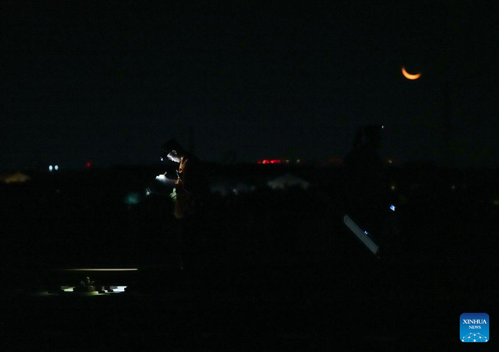 A staff member controls a drone to inspect the Hangzhou-Shaoxing-Taizhou intercity railway in east China's Zhejiang Province on early Aug. 20, 2025. Staff members inspected and maintained several systems of the railway on early Wednesday to ensure the stable operation of the Hangzhou-Shaoxing-Taizhou intercity railway.