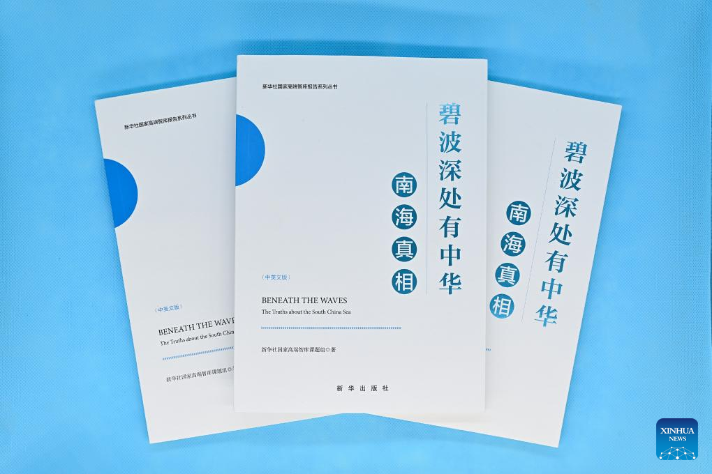 This photo shows copies of the report titled "The Truths about the South China Sea" published in both Chinese and English by Xinhua Institute, a think tank affiliated with Xinhua News Agency. (Xinhua/Li Xin)