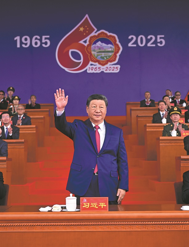 President Xi Jinping, who is also general secretary of the Communist Party of China Central Committee and chairman of the Central Military Commission, attends a grand gathering on Thursday at the Potala Palace square in Lhasa, capital of the Xizang autonomous region, to mark the region's 60th founding anniversary. XINHUA