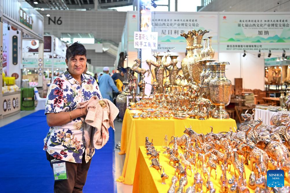 An exhibitor is pictured at the 7th Shanxi Cultural Industries Fair in Taiyuan, north China's Shanxi Province, Aug. 21, 2025. The fair kicked off here on Thursday and will last till Aug. 25, attracting about 2,000 exhibitors from over 30 countries and regions worldwide. (Xinhua/Yang Chenguang)