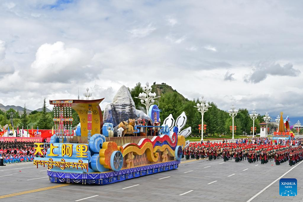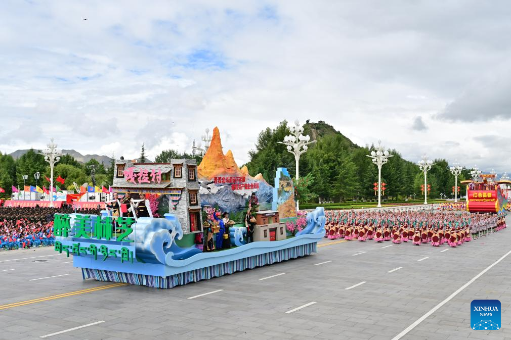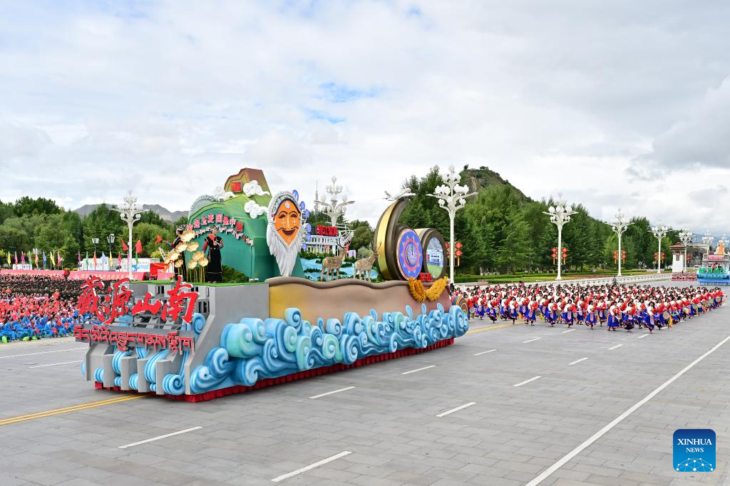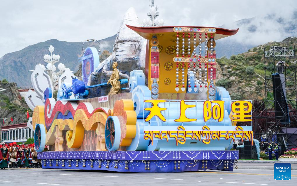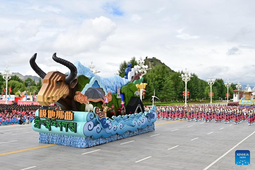A parade float takes part in a grand gathering to celebrate Xizang Autonomous Region's 60th founding anniversary in Lhasa, southwest China's Xizang Autonomous Region, Aug. 21, 2025. Around 20,000 local officials and people from all ethnic groups and all walks of life joined in the celebration. (Xinhua/Tenzing Nima Qadhup)