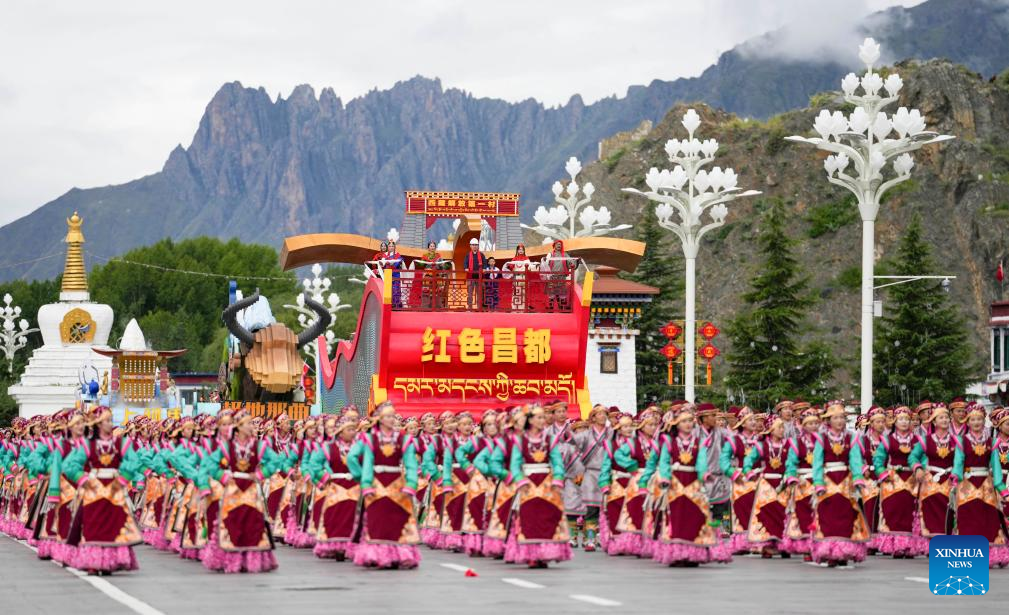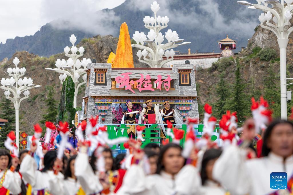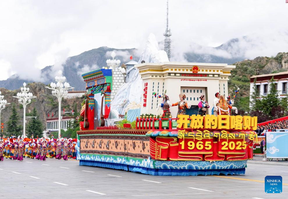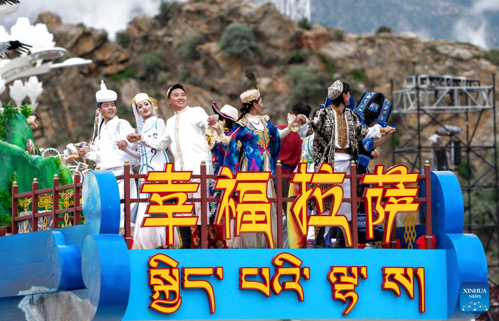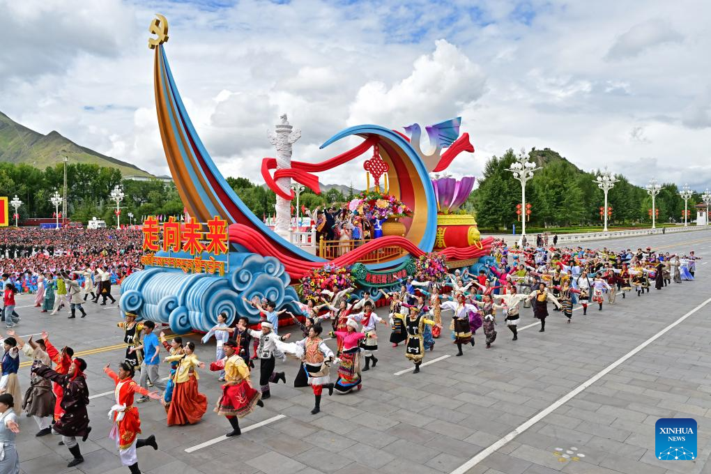 A parade float takes part in a grand gathering to celebrate Xizang Autonomous Region's 60th founding anniversary in Lhasa, southwest China's Xizang Autonomous Region, Aug. 21, 2025. Around 20,000 local officials and people from all ethnic groups and all walks of life joined in the celebration. (Xinhua/Jigme Dorje)