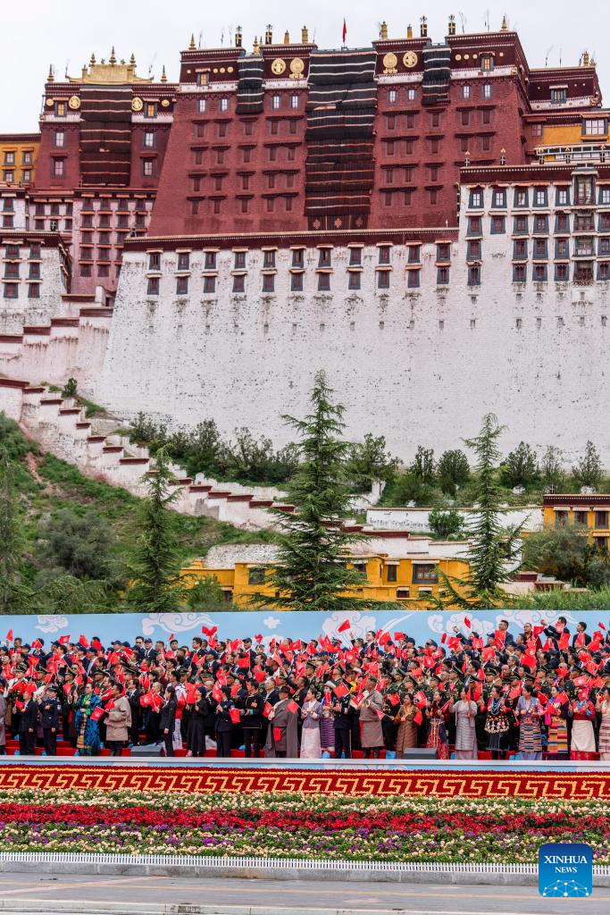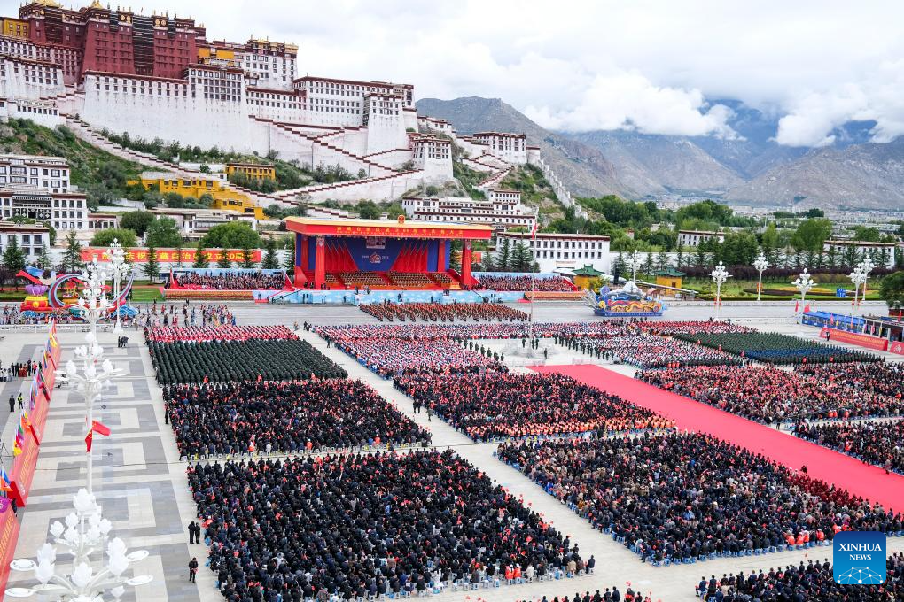 This photo taken on Aug. 21, 2025 shows a grand gathering to celebrate Xizang Autonomous Region's 60th founding anniversary in Lhasa, southwest China's Xizang Autonomous Region. Around 20,000 local officials and people from all ethnic groups and all walks of life joined in the celebration. (Photo by Sonam Wangchug/Xinhua)