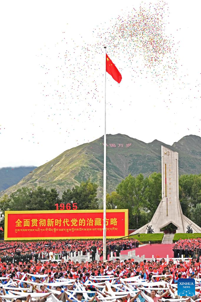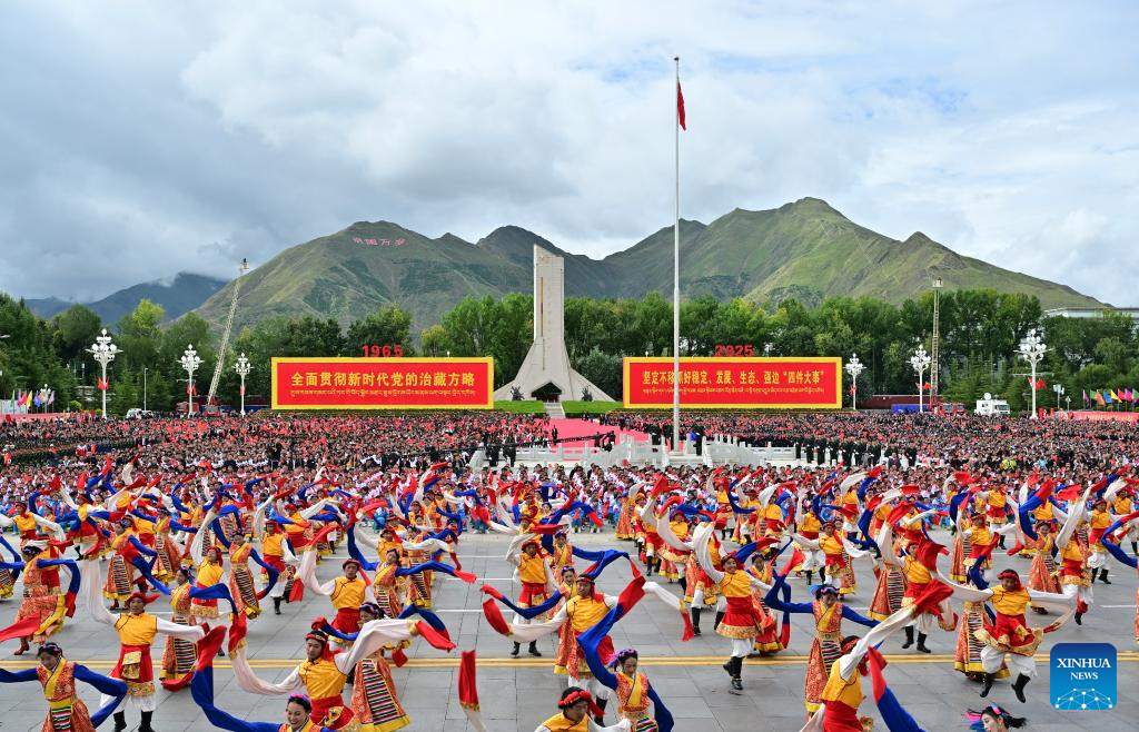This photo taken on Aug. 21, 2025 shows a grand gathering to celebrate Xizang Autonomous Region's 60th founding anniversary in Lhasa, southwest China's Xizang Autonomous Region. Around 20,000 local officials and people from all ethnic groups and all walks of life joined in the celebration. (Xinhua/Zhai Jianlan)
