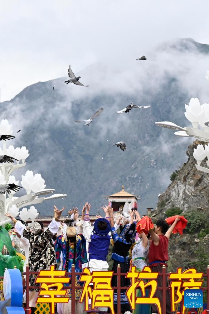 Performers on a parade float release doves during a grand gathering to celebrate Xizang Autonomous Region's 60th founding anniversary in Lhasa, southwest China's Xizang Autonomous Region, Aug. 21, 2025. Around 20,000 local officials and people from all ethnic groups and all walks of life joined in the celebration. (Xinhua/Shen Hong)
