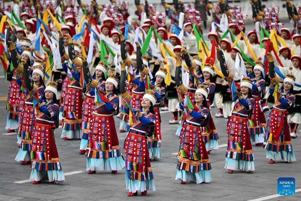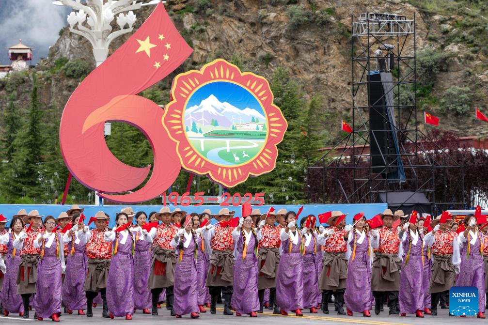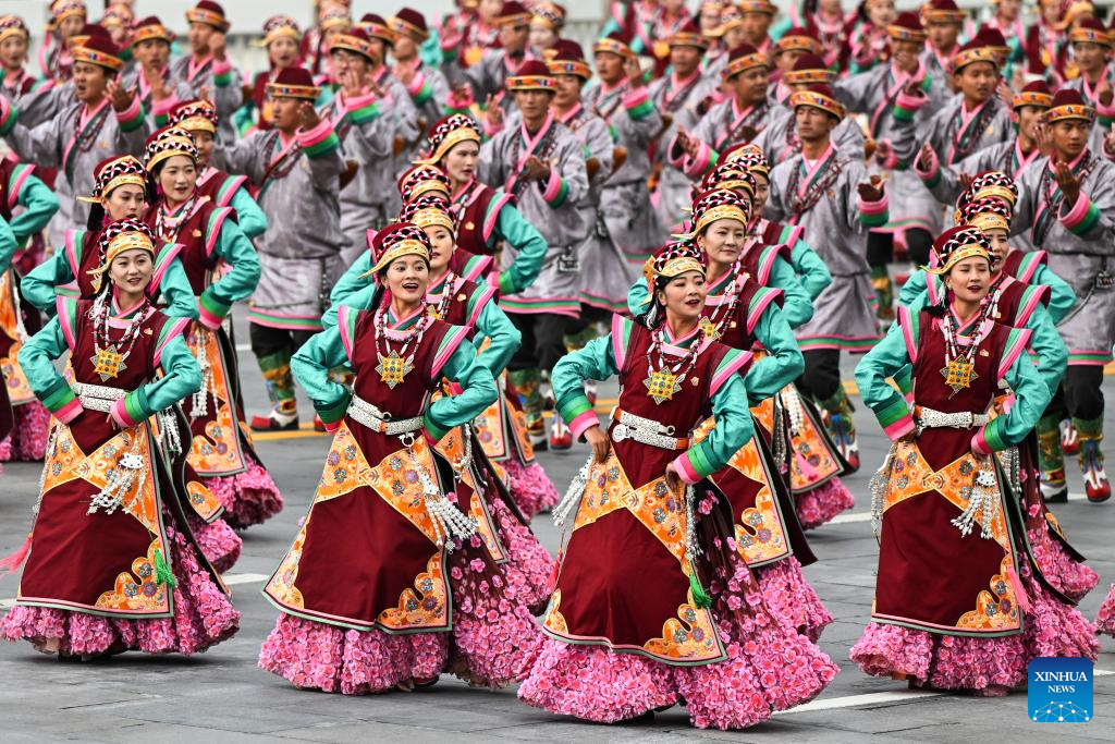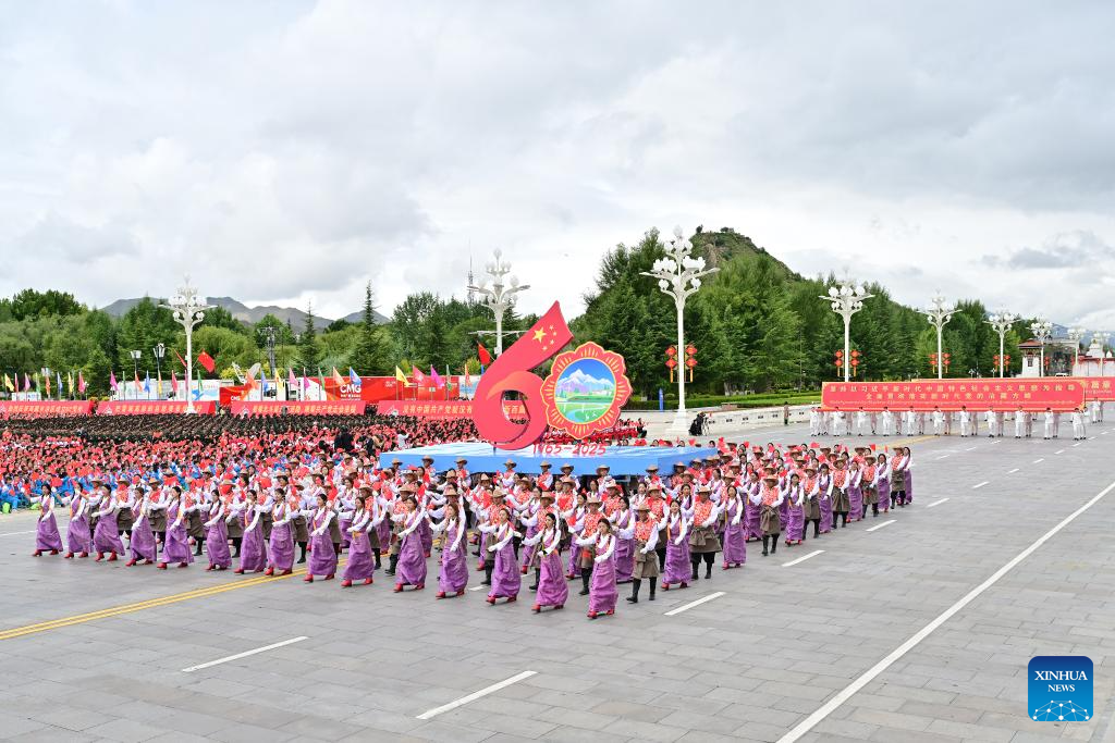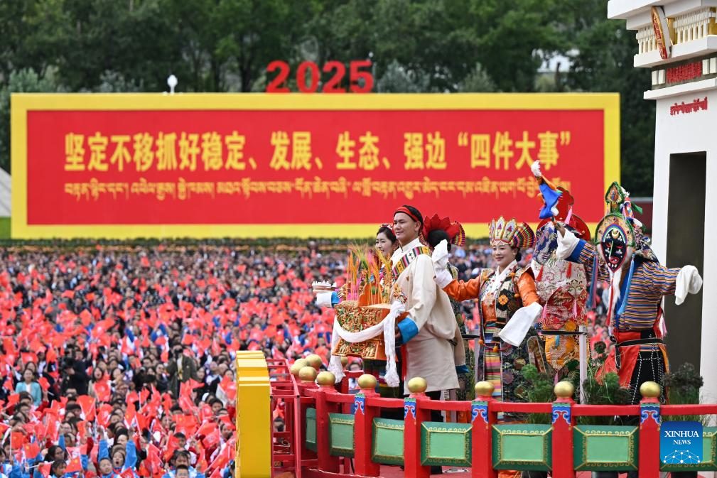 People take part in a mass parade during a grand gathering to celebrate Xizang Autonomous Region's 60th founding anniversary in Lhasa, southwest China's Xizang Autonomous Region, Aug. 21, 2025. Around 20,000 local officials and people from all ethnic groups and all walks of life joined in the celebration. (Xinhua/Jigme Dorje)