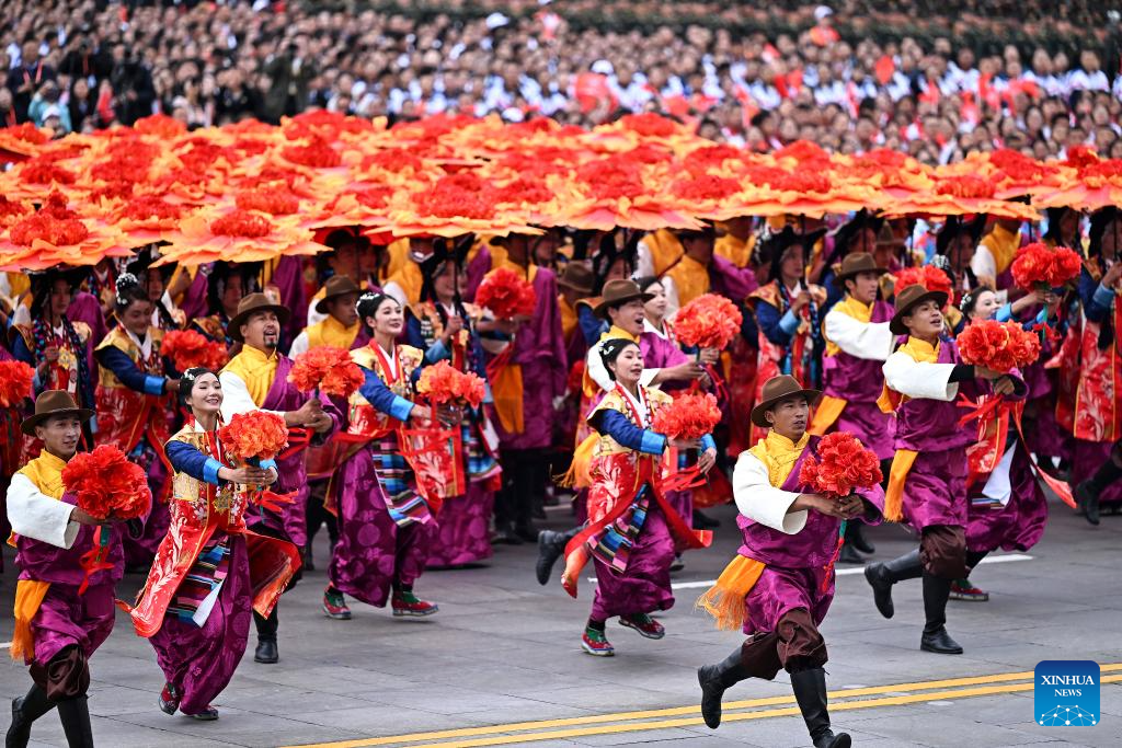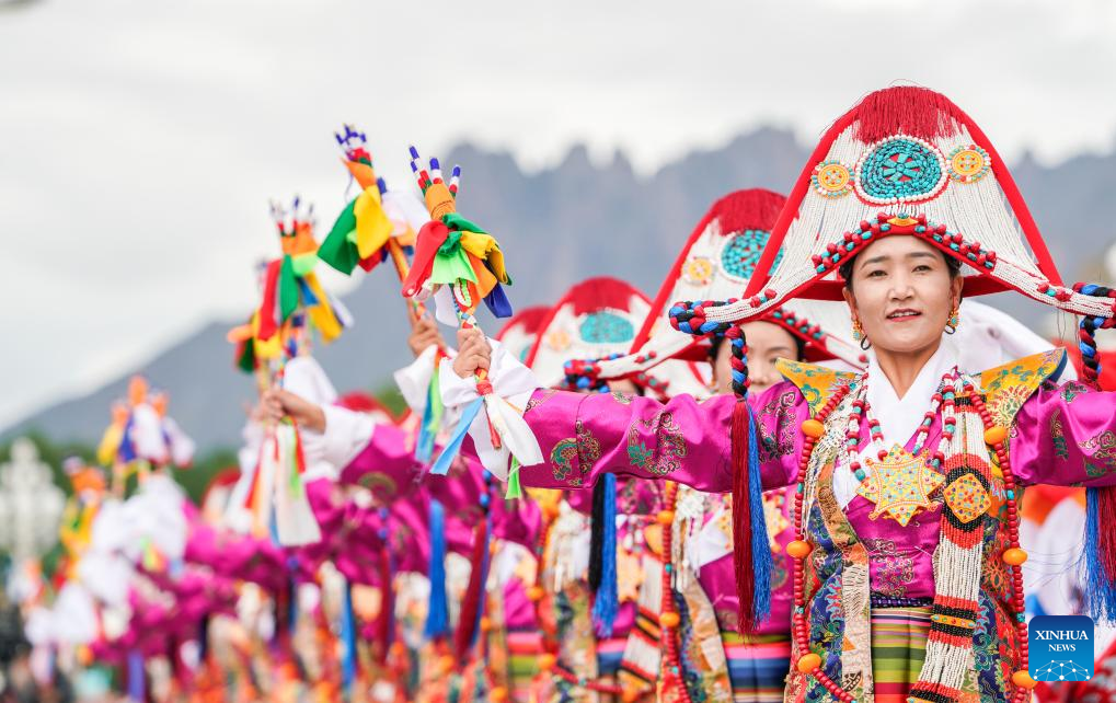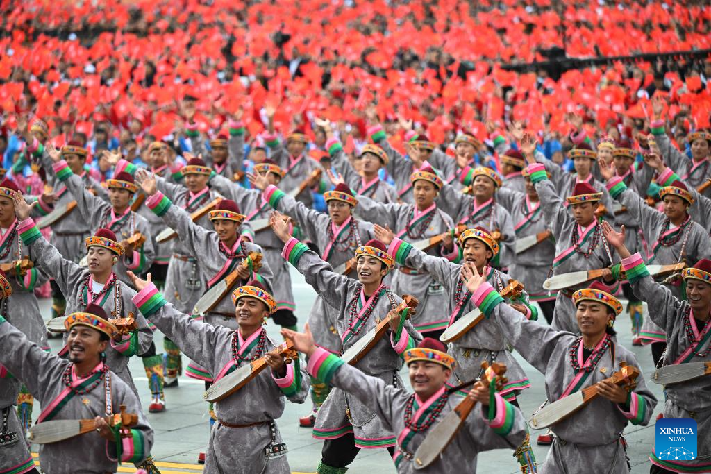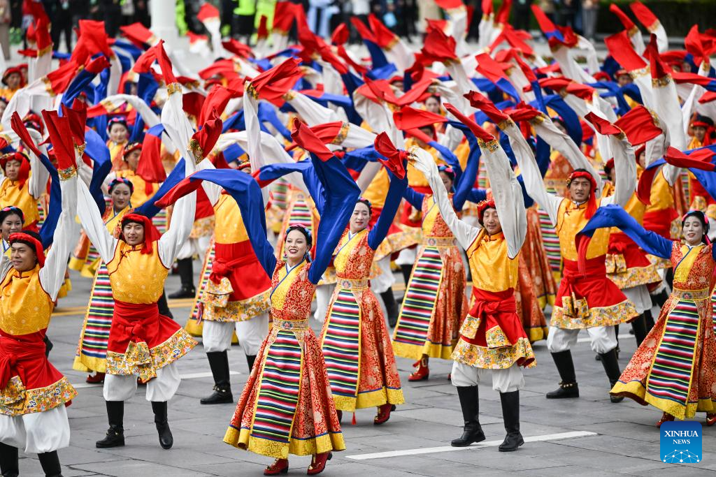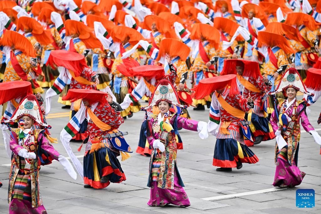 People take part in a mass parade during a grand gathering to celebrate Xizang Autonomous Region's 60th founding anniversary in Lhasa, southwest China's Xizang Autonomous Region, Aug. 21, 2025. Around 20,000 local officials and people from all ethnic groups and all walks of life joined in the celebration. (Xinhua/Jigme Dorje)