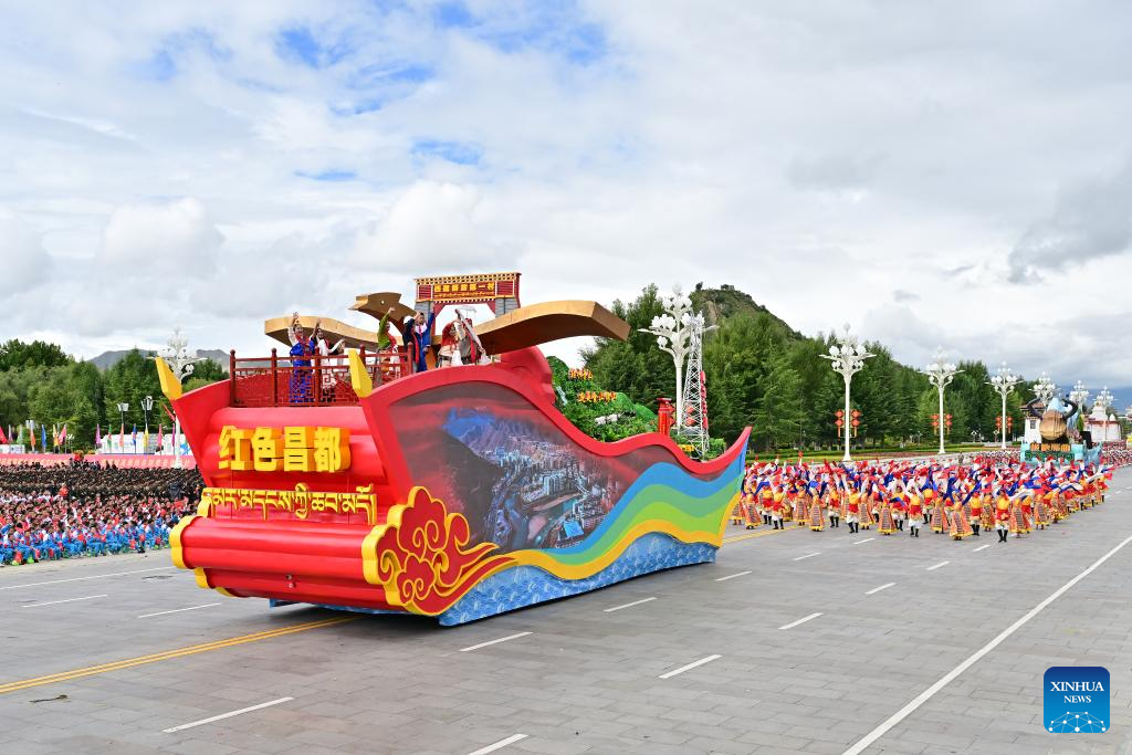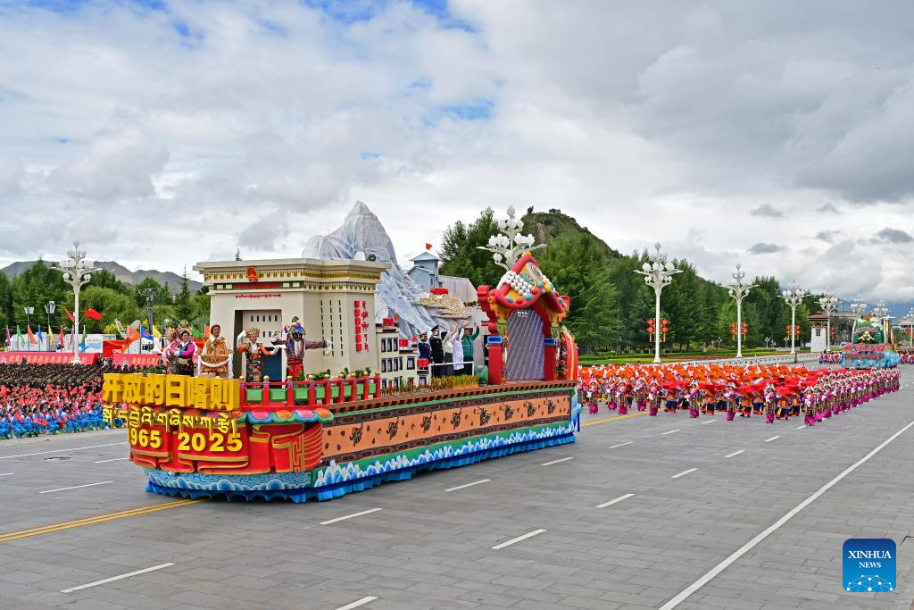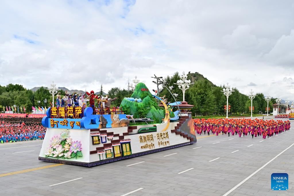 A parade float takes part in a grand gathering to celebrate Xizang Autonomous Region's 60th founding anniversary in Lhasa, southwest China's Xizang Autonomous Region, Aug. 21, 2025. Around 20,000 local officials and people from all ethnic groups and all walks of life joined in the celebration. (Xinhua/Xie Huanchi)