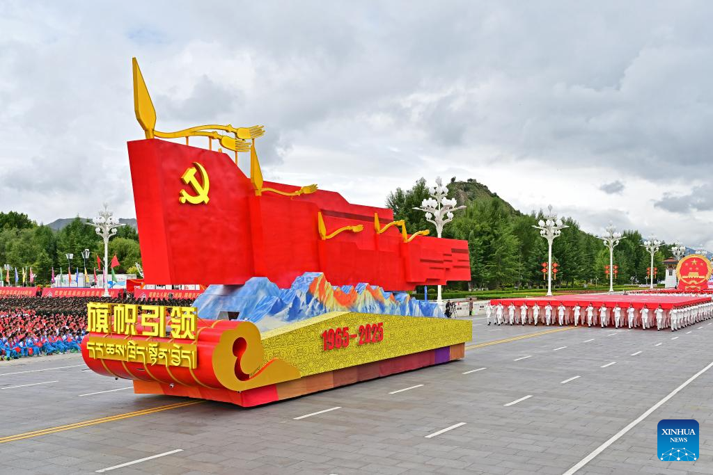 A parade float takes part in a grand gathering to celebrate Xizang Autonomous Region's 60th founding anniversary in Lhasa, southwest China's Xizang Autonomous Region, Aug. 21, 2025. Around 20,000 local officials and people from all ethnic groups and all walks of life joined in the celebration. (Xinhua/Zhai Jianlan)
