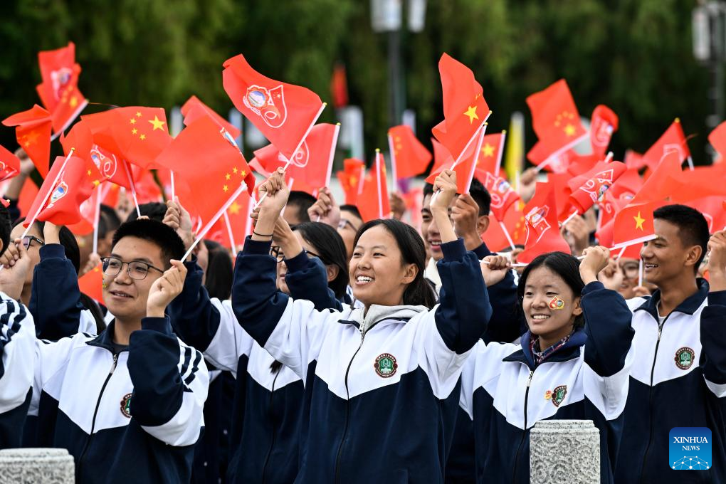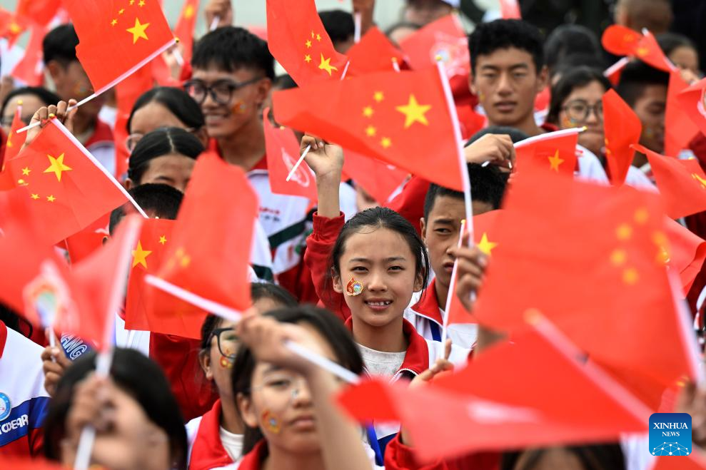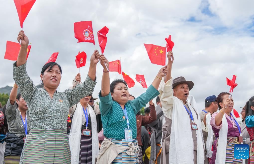 People wave flags during a grand gathering to celebrate Xizang Autonomous Region's 60th founding anniversary in Lhasa, southwest China's Xizang Autonomous Region, Aug. 21, 2025. Around 20,000 local officials and people from all ethnic groups and all walks of life joined in the celebration. (Xinhua/Jigme Dorje)