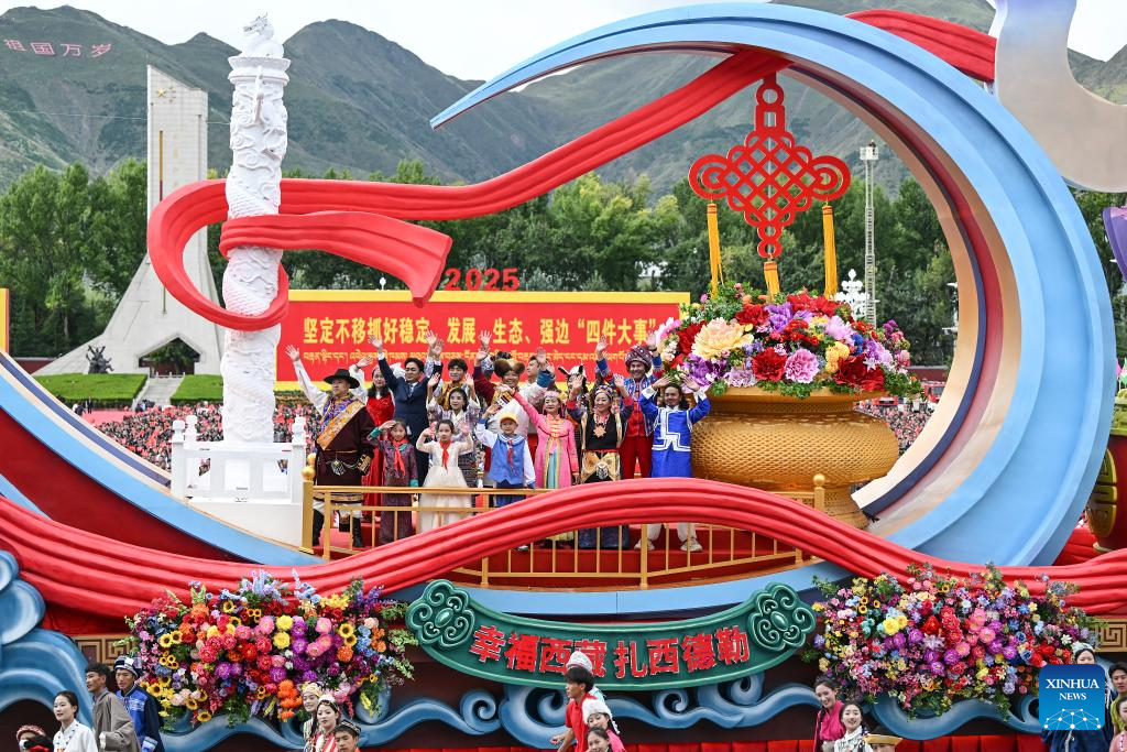 A parade float takes part in a grand gathering to celebrate Xizang Autonomous Region's 60th founding anniversary in Lhasa, southwest China's Xizang Autonomous Region, Aug. 21, 2025. Around 20,000 local officials and people from all ethnic groups and all walks of life joined in the celebration. (Xinhua/Tenzin Nyida)