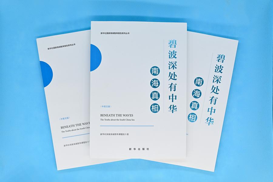 This photo shows copies of the report titled "The Truths about the South China Sea" published in both Chinese and English by Xinhua Institute, a think tank affiliated with Xinhua News Agency. (Xinhua/Li Xin)