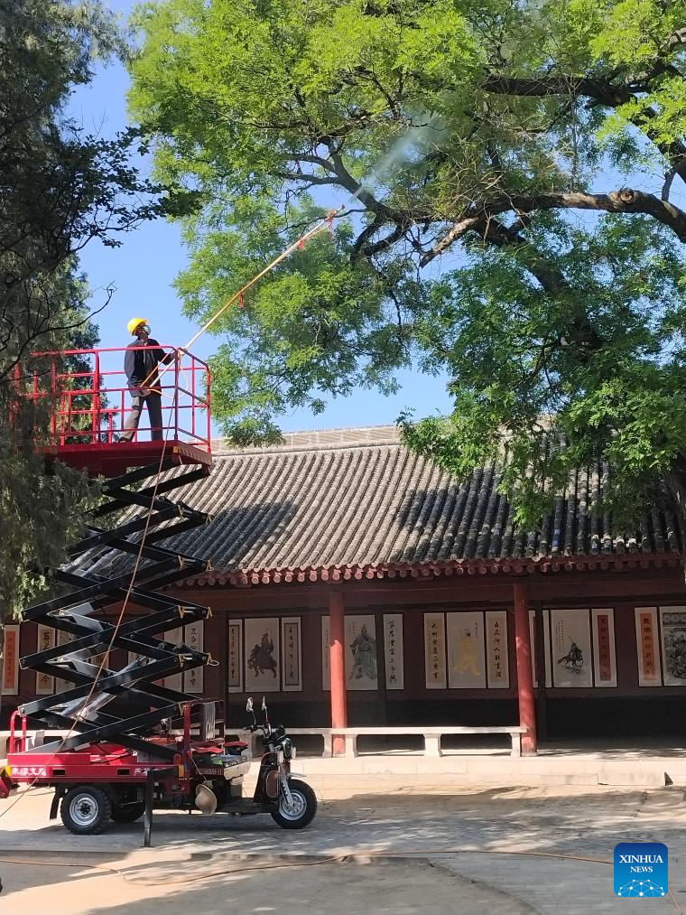 A staff member cleans an ancient tree at the Temple of Guan Yu in Yuncheng, north China's Shanxi Province, July 25, 2025. (Xinhua)