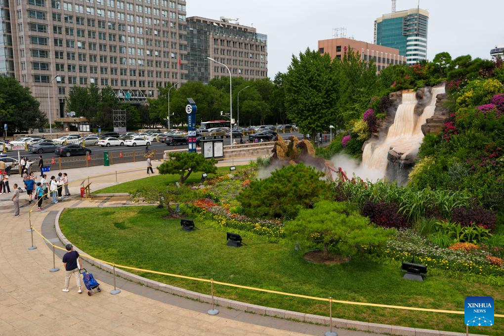 A set of floral installation is pictured at Xidan area in Beijing, capital of China, Aug. 22, 2025. Ten sets of floral installations along Chang'an Avenue marking the 80th anniversary of the victory in the Chinese People's War of Resistance Against Japanese Aggression and the World Anti-Fascist War have been completed. (Xinhua/Ju Huanzong)