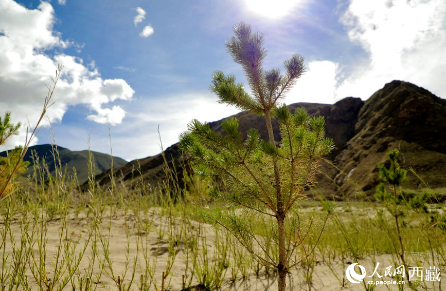 A once-barren mountainous area plagued by sand and dust is transforming into green terrain in Gonggar county, southwest China's Xizang Autonomous Region, thanks to a massive tree-planting effort.