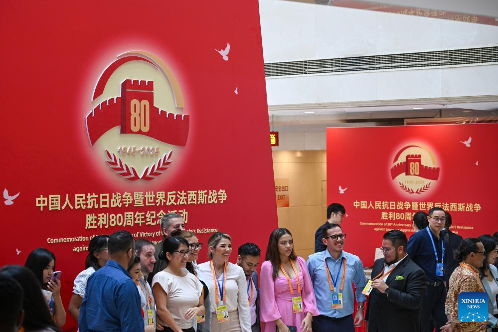 Journalists pose for a group photo at the press center of Commemoration of 80th Anniversary of Victory of Chinese People's Resistance against Japanese Aggression and World Anti-Fascist War in Beijing, capital of China, Aug. 28, 2025. The press center has opened here on Wednesday.