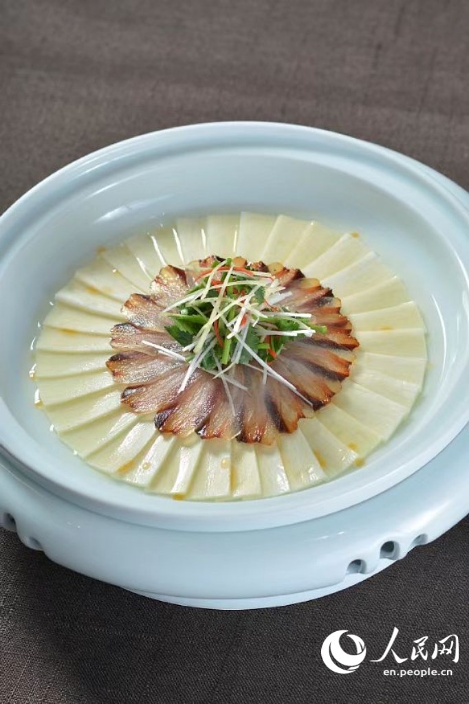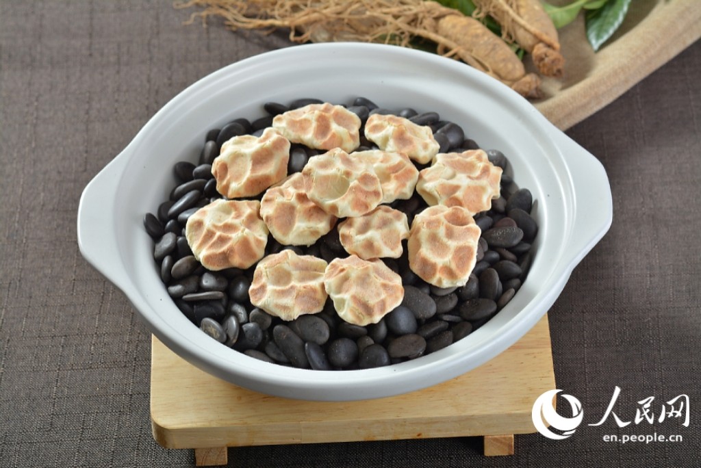 Ginseng simmered with deer-hide gelatin, complemented by honey and fruit for a mildly sweet taste and a smooth, tender, and pleasantly springy texture at a restaurant in Tonghua, northeast China's Jilin Province. (People's Daily Online/Zhao Tong)