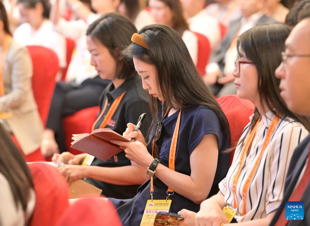 Journalists work at a press conference held by the press center of Commemoration of 80th Anniversary of Victory in Chinese People's Resistance against Japanese Aggression and World Anti-Fascist War in Beijing, capital of China, Aug. 31, 2025. Ma Feixiong, vice minister of the Ministry of Veterans Affairs, and Sun Deli, deputy head of the National Cultural Heritage Administration, introduced newly designated memorial facilities and historical sites related to the War of Resistance, and a new list of heroes from the war at the press conference.