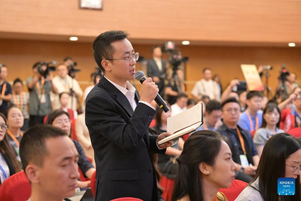 A journalist asks questions at a press conference held by the press center of Commemoration of 80th Anniversary of Victory in Chinese People's Resistance against Japanese Aggression and World Anti-Fascist War in Beijing, capital of China, Aug. 31, 2025. Ma Feixiong, vice minister of the Ministry of Veterans Affairs, and Sun Deli, deputy head of the National Cultural Heritage Administration, introduced newly designated memorial facilities and historical sites related to the War of Resistance, and a new list of heroes from the war at the press conference.