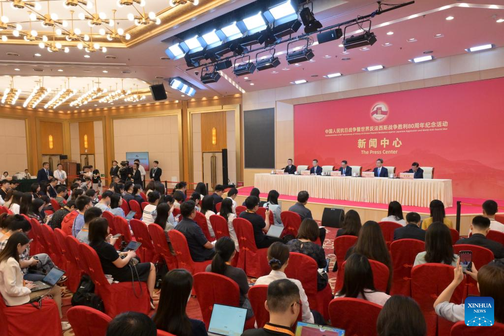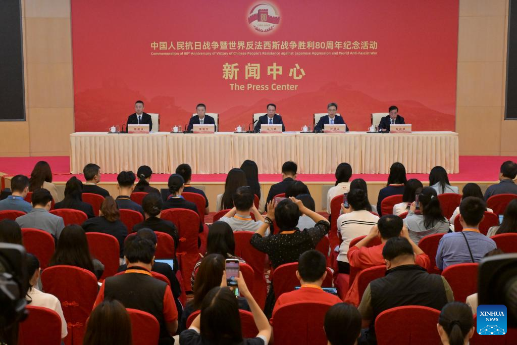The press center of Commemoration of 80th Anniversary of Victory in Chinese People's Resistance against Japanese Aggression and World Anti-Fascist War holds a press conference in Beijing, capital of China, Aug. 31, 2025. Ma Feixiong, vice minister of the Ministry of Veterans Affairs, and Sun Deli, deputy head of the National Cultural Heritage Administration, introduced newly designated memorial facilities and historical sites related to the War of Resistance, and a new list of heroes from the war at the press conference.