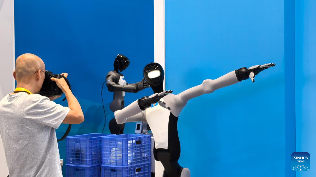 A photographer is attracted by a robot demonstrating the dexterity of its arms at the media center for the Shanghai Cooperation Organization (SCO) Summit 2025 in north China's Tianjin, on Aug. 30, 2025. A variety of robots have attracted numerous eyes at the media center as the SCO Summit 2025 is held in this port city from Aug. 31 to Sept. 1. (Xinhua/Wang Jianhua)