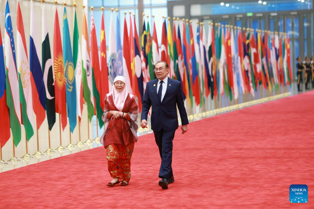 Malaysian Prime Minister Anwar Ibrahim and his wife arrive at the Meijiang Convention and Exhibition Center for a welcoming banquet in Tianjin, north China, Aug. 31, 2025. Chinese President Xi Jinping and his wife, Peng Liyuan, on Sunday hosted a banquet in China's port city of Tianjin to welcome international guests who are here to attend the Shanghai Cooperation Organization (SCO) Summit 2025. (Xinhua/Ding Haitao)