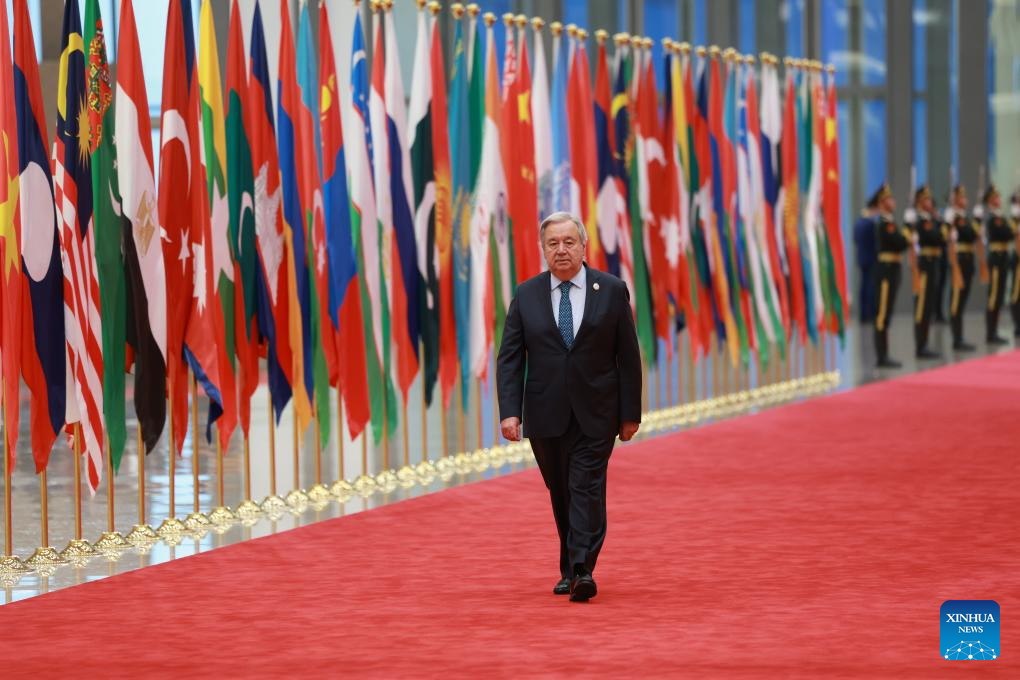 UN Secretary-General Antonio Guterres arrives at the Meijiang Convention and Exhibition Center for a welcoming banquet in Tianjin, north China, Aug. 31, 2025. Chinese President Xi Jinping and his wife, Peng Liyuan, on Sunday hosted a banquet in China's port city of Tianjin to welcome international guests who are here to attend the Shanghai Cooperation Organization (SCO) Summit 2025. (Xinhua/Ding Haitao)
