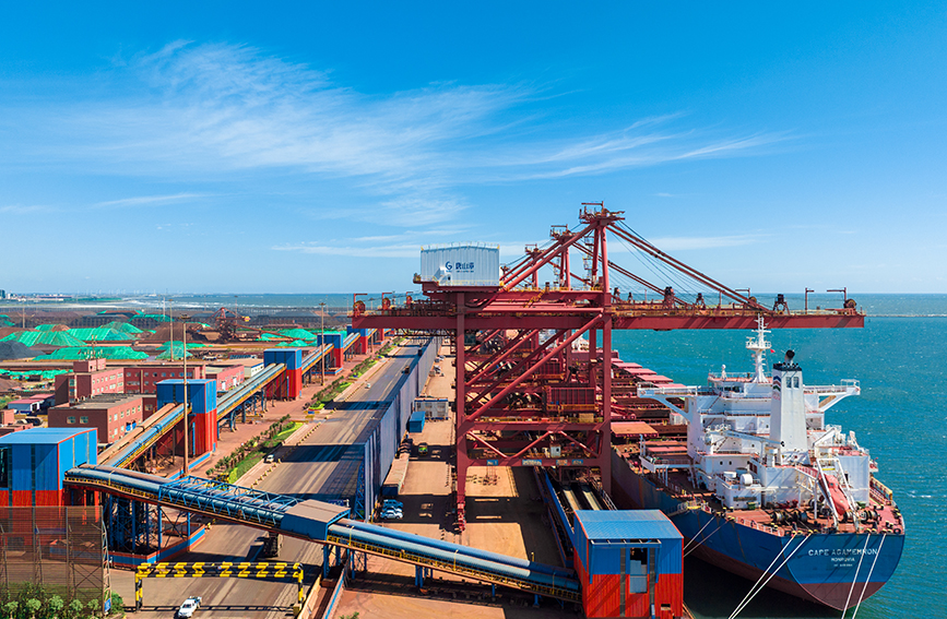 A cargo ship docks at the ore terminal in the Jingtang port area of Tangshan Port, Hebei Port Group, Tangshan, north China's Hebei Province. (Photo courtesy of Hebei Port Group)