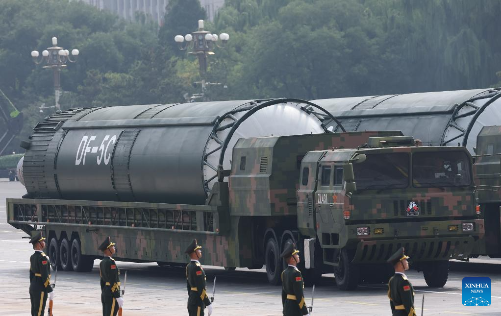 The nuclear missile formation attends a military parade in Beijing, capital of China, Sept. 3, 2025. China on Wednesday held a grand gathering to commemorate the 80th anniversary of the victory in the Chinese People's War of Resistance against Japanese Aggression and the World Anti-Fascist War. (Xinhua/Pan Yulong)