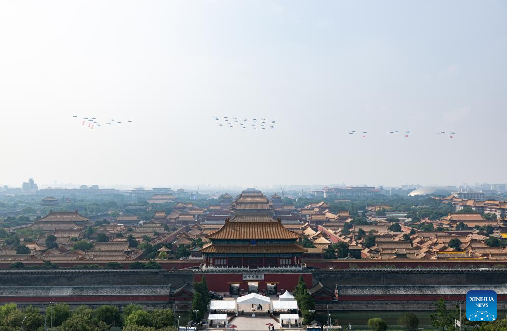 The flag-guarding air echelon attends a military parade in Beijing, capital of China, Sept. 3, 2025. China on Wednesday held a grand gathering to commemorate the 80th anniversary of the victory in the Chinese People's War of Resistance against Japanese Aggression and the World Anti-Fascist War. (Xinhua/Wang Jingqiang)
