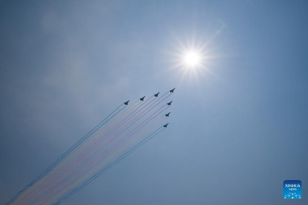 The trainer aircraft echelon attends a military parade in Beijing, capital of China, Sept. 3, 2025. China on Wednesday held a grand gathering to commemorate the 80th anniversary of the victory in the Chinese People's War of Resistance against Japanese Aggression and the World Anti-Fascist War. (Xinhua/Lian Zhen)