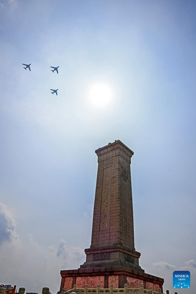 The bomber echelon flies over Tian'anmen Square during a military parade in Beijing, capital of China, Sept. 3, 2025. China on Wednesday held a grand gathering to commemorate the 80th anniversary of the victory in the Chinese People's War of Resistance against Japanese Aggression and the World Anti-Fascist War. (Xinhua/Liu Ying)