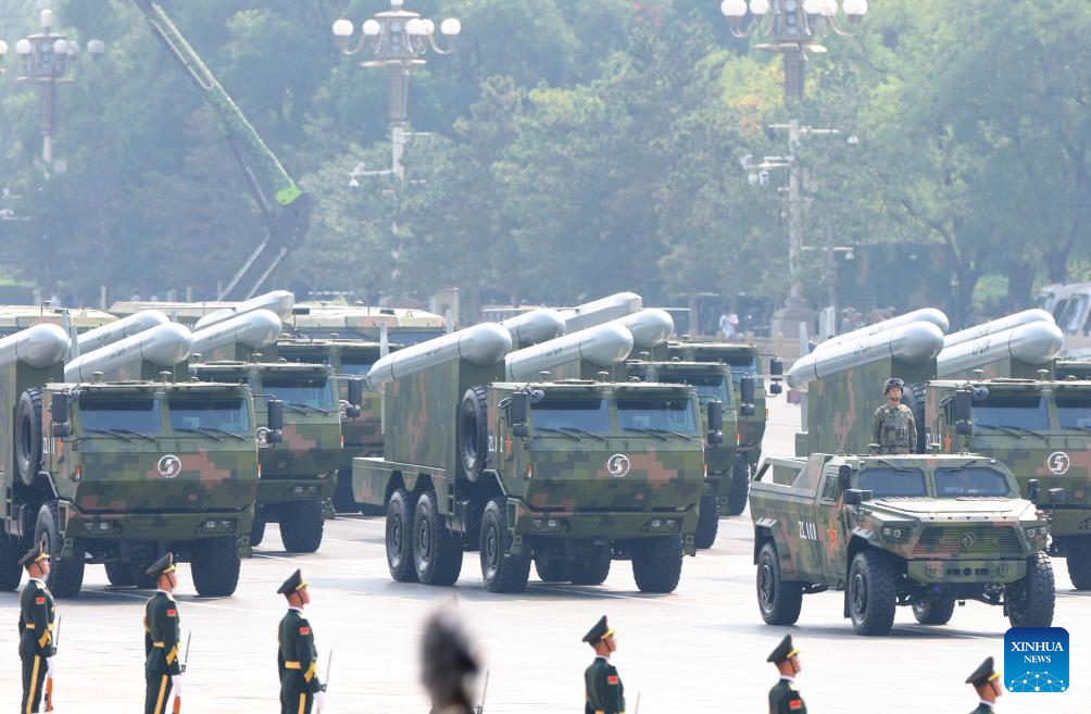 The hypersonic missile formation attends a military parade in Beijing, capital of China, Sept. 3, 2025. China on Wednesday held a grand gathering to commemorate the 80th anniversary of the victory in the Chinese People's War of Resistance against Japanese Aggression and the World Anti-Fascist War. (Xinhua/Liu Dawei)