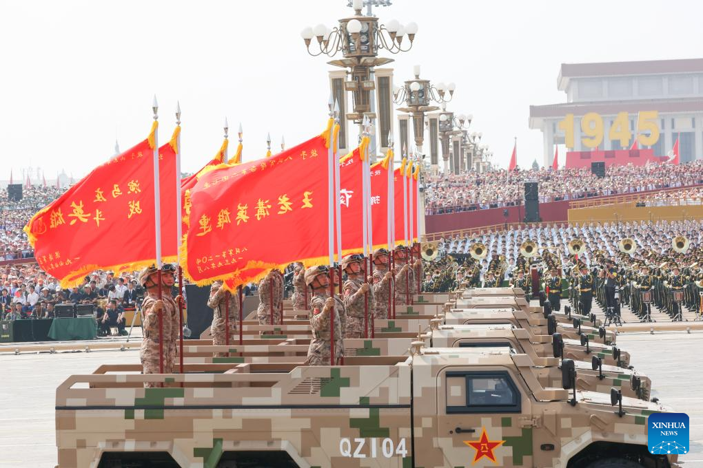 Hero units' banner formation marches through Tian'anmen Square during a military parade in Beijing, capital of China, Sept. 3, 2025. China on Wednesday held a grand gathering to commemorate the 80th anniversary of the victory in the Chinese People's War of Resistance against Japanese Aggression and the World Anti-Fascist War. (Xinhua/Yao Dawei)