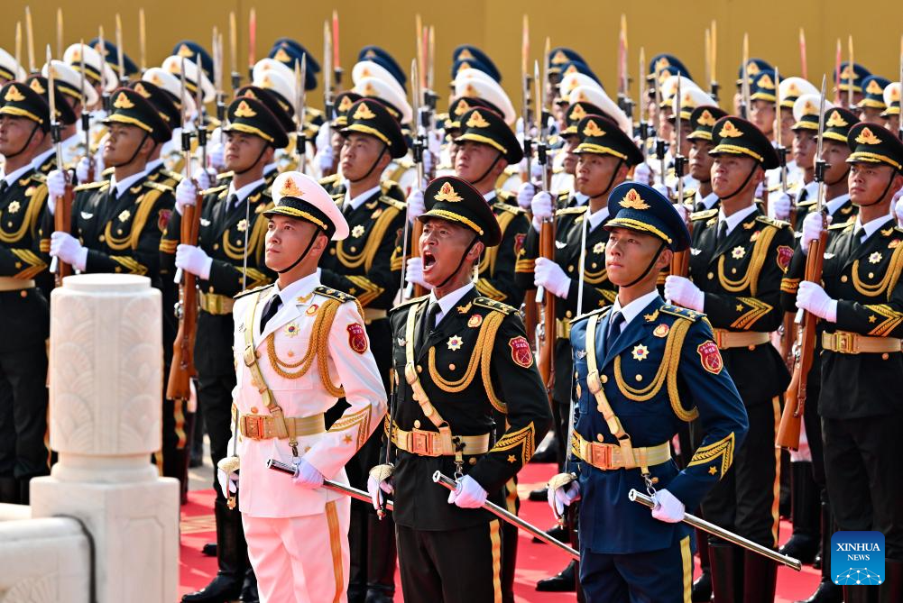Honor guards stand in formation during a grand gathering to commemorate the 80th anniversary of the victory in the Chinese People's War of Resistance against Japanese Aggression and the World Anti-Fascist War in Beijing, capital of China, Sept. 3, 2025. (Xinhua/Zhang Hongxiang)