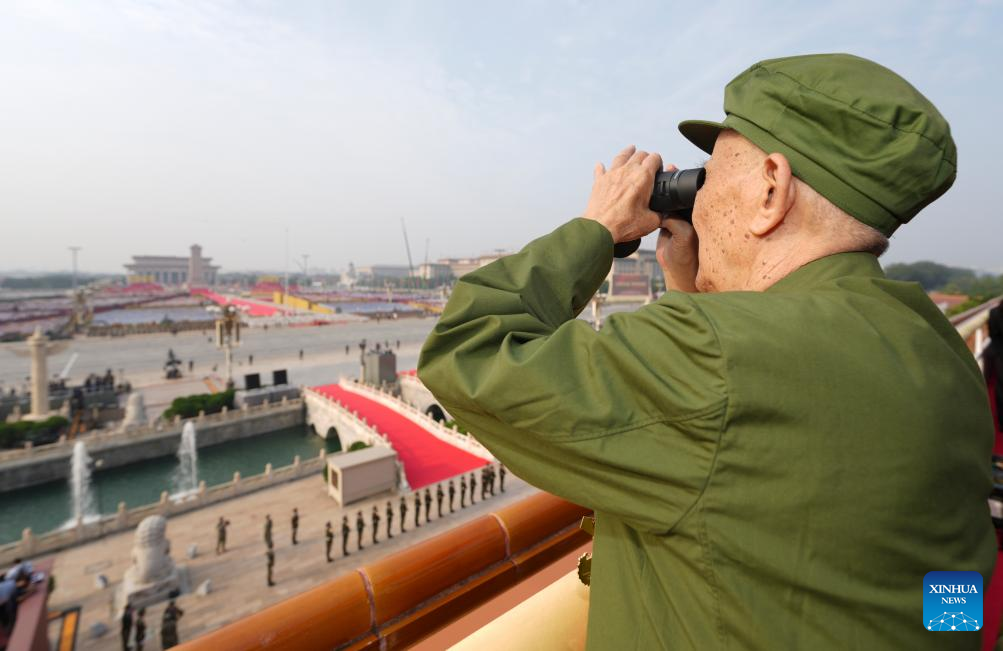 A veteran is pictured at Tian'anmen Rostrum ahead of a military parade in Beijing, capital of China, Sept. 3, 2025. China on Wednesday held a grand gathering to commemorate the 80th anniversary of the victory in the Chinese People's War of Resistance against Japanese Aggression and the World Anti-Fascist War. (Xinhua/Cai Yang)