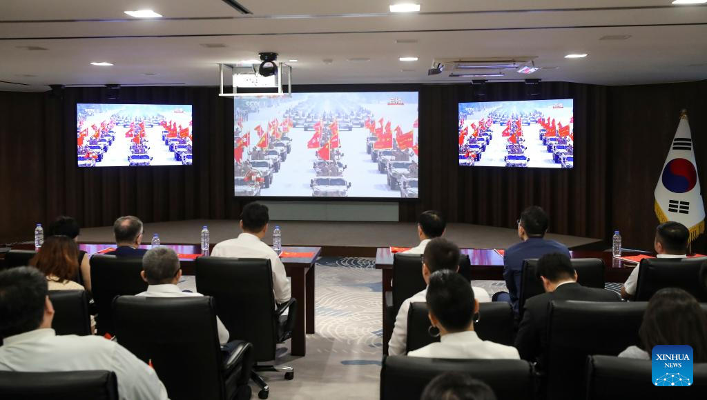 Overseas Chinese watch live broadcasting of a grand gathering to commemorate the 80th anniversary of the victory in the Chinese People's War of Resistance against Japanese Aggression and the World Anti-Fascist War in Seoul, South Korea, Sept. 3, 2025. (Xinhua/Yao Qilin)