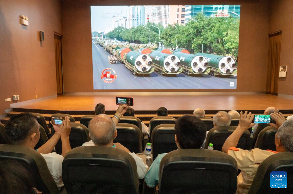 Overseas Chinese watch live broadcasting of a grand gathering to commemorate the 80th anniversary of the victory in the Chinese People's War of Resistance against Japanese Aggression and the World Anti-Fascist War in Kuala Lumpur, Malaysia, Sept. 3, 2025. (Photo by Chong Voon Chung/Xinhua)