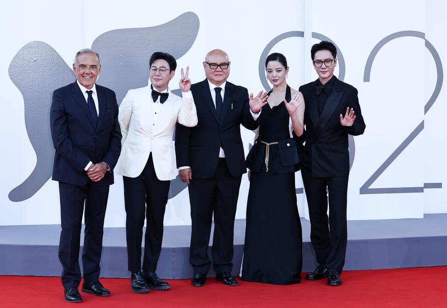 Venice Film Festival director Alberto Barbera (1st L) and Cai Shangjun (3rd L), director of the film "The Sun Rises On Us All," with the film's cast members Zhang Songwen (2nd L), Xin Zhilei (2nd R) and Feng Shaofeng pose at the red carpet of the premiere during the 82nd Venice Film Festival in Venice, Italy, Sept. 5, 2025. (Xinhua/Li Jing)