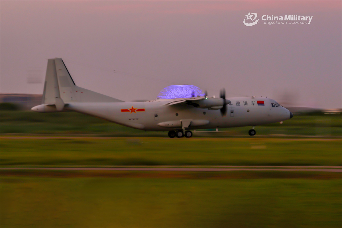 Y-9 transport aircraft attached to an aviation regiment with the navy under the Chinese PLA Eastern Theater Command speeds up to take off during a day-and-night flight training exercise on August 21, 2025. (eng.chinamil.com.cn/Photo by Wang Haojing)