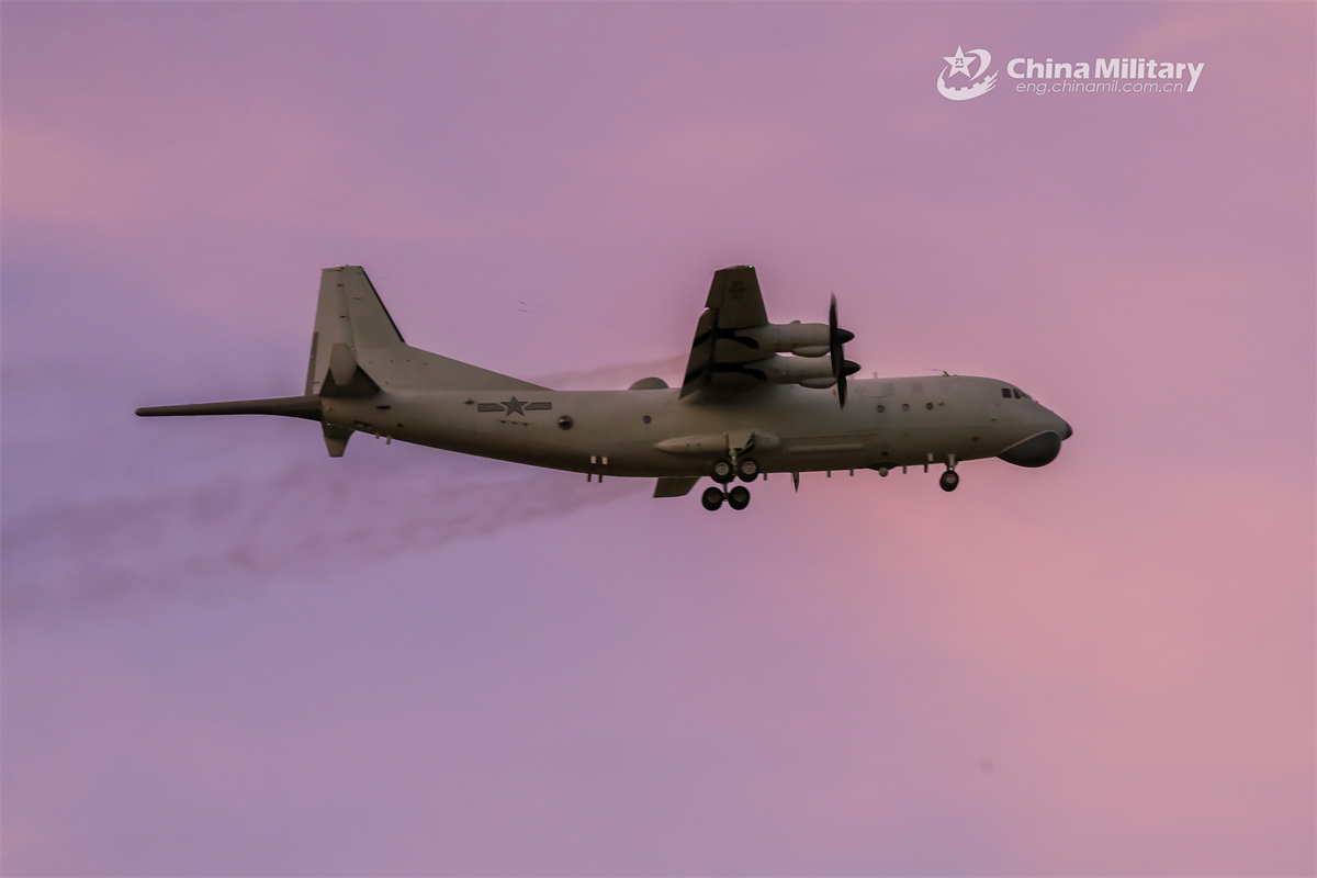 Y-9 transport aircraft attached to an aviation regiment with the navy under the Chinese PLA Eastern Theater Command flies at sunset during a day-and-night flight training exercise on August 21, 2025. (eng.chinamil.com.cn/Photo by Wang Haojing)