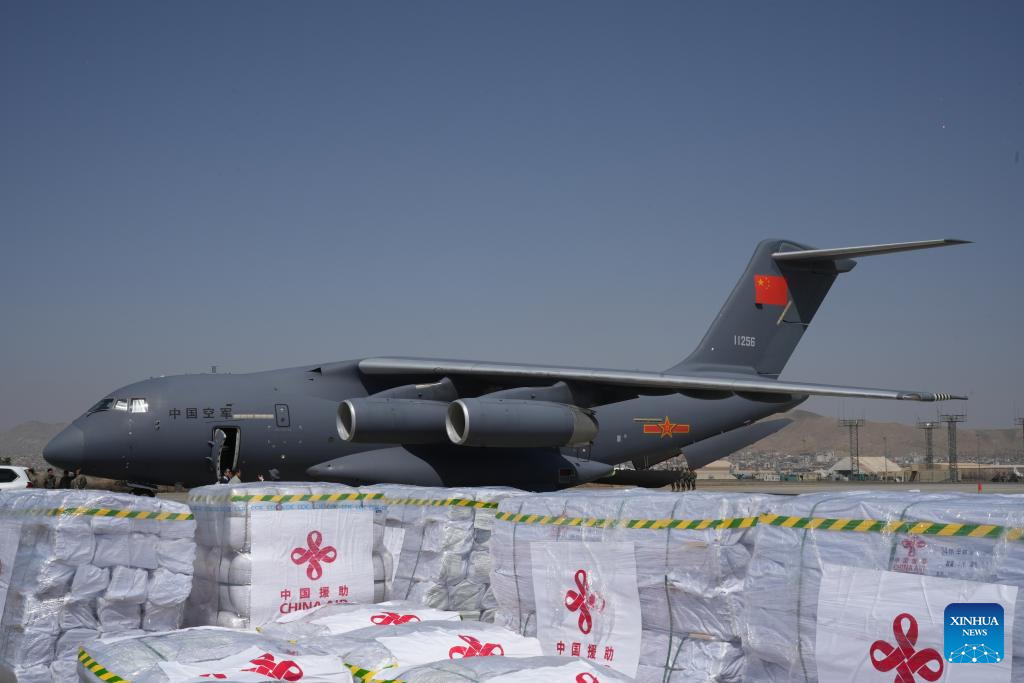 Emergency earthquake relief supplies provided by the Chinese government to Afghanistan are unloaded from a Y-20 aircraft of the Chinese People's Liberation Army Air Force at the Kabul airport in Kabul, Afghanistan, Sept. 7, 2025. (Xinhua/Li Ang)