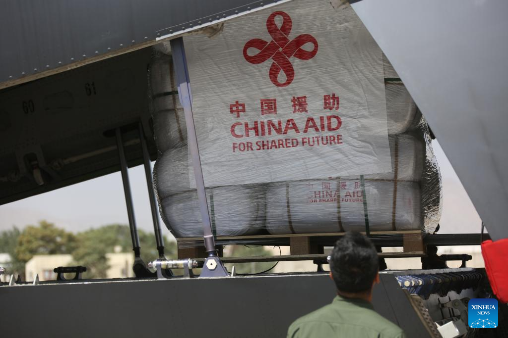 Emergency earthquake relief supplies provided by the Chinese government to Afghanistan are unloaded from a Y-20 aircraft of the Chinese People's Liberation Army Air Force at the Kabul airport in Kabul, Afghanistan, Sept. 7, 2025.(Xinhua/Li Ang)