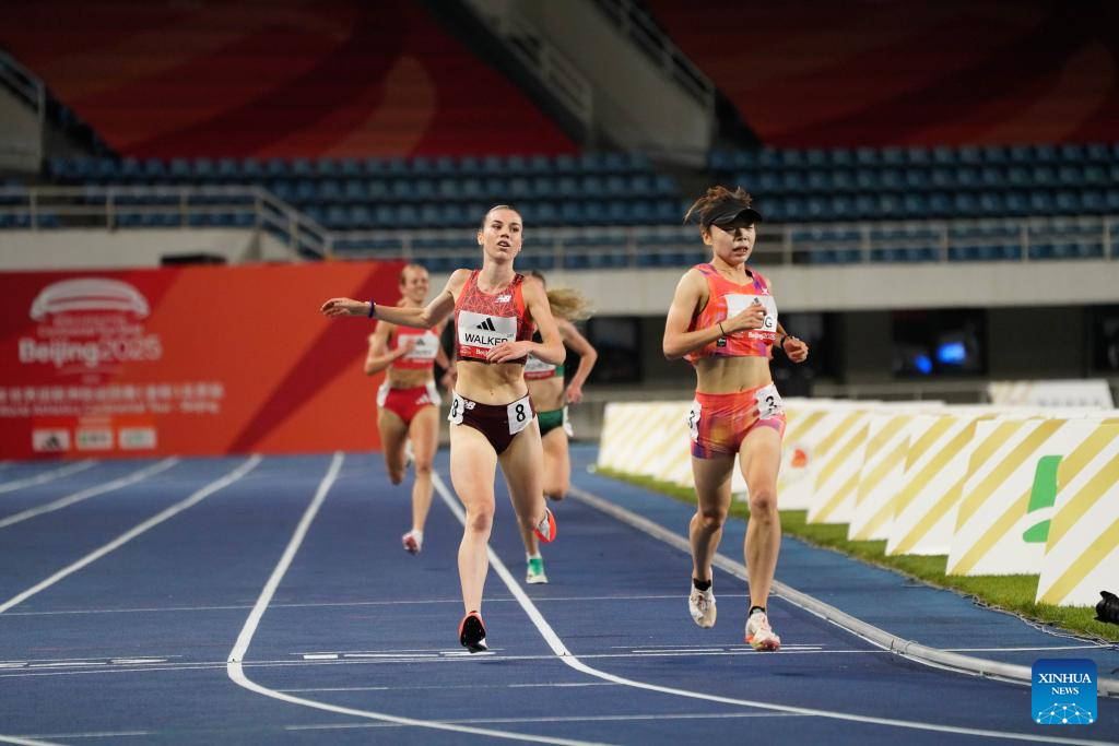Liang Tiantian (R) of China crosses the finish line during the Women's 3000M event at 2025 World Athletics Continental Tour in Beijing, China, on Sept. 7, 2025. (Xinhua/Xie Han)