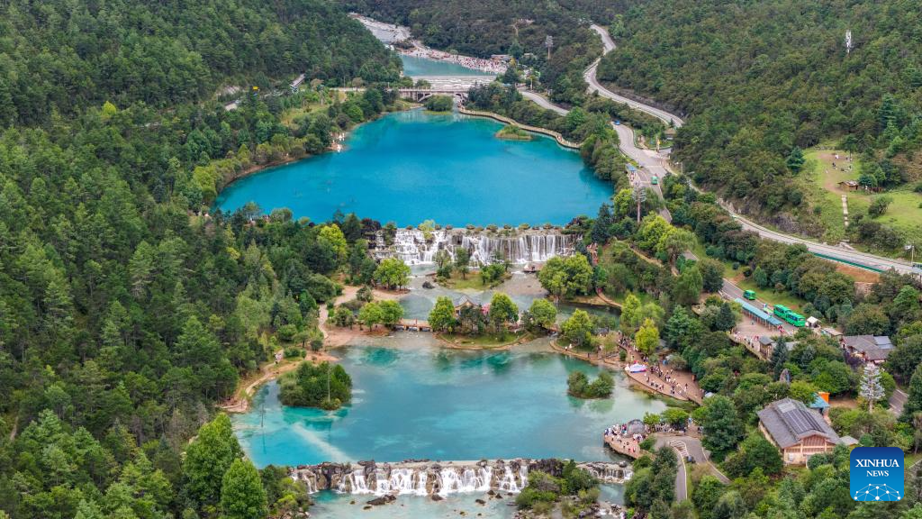 An aerial drone photo taken on Sept. 8, 2025 shows tourists visiting the Lanyue (Blue Moon) Valley in Lijiang City, southwest China's Yunnan Province. (Xinhua/Hu Chao)