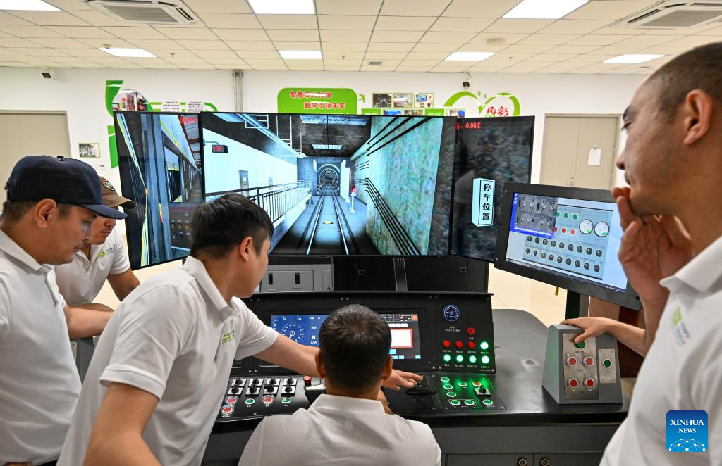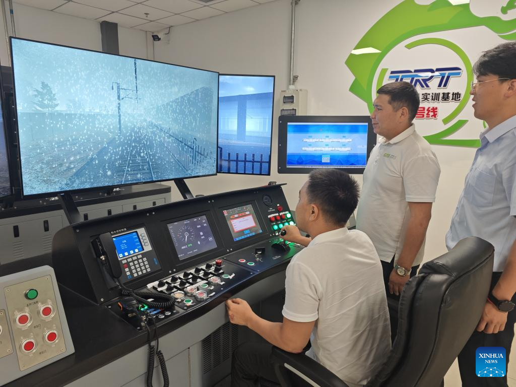 A Kazakh trainee (C) operates a full-function driving simulator during a light-rail driver training session in north China's Tianjin Municipality, July 17, 2025. A batch of 29 drivers from Kazakhstan have recently qualified as light-rail drivers after finishing immersive training sessions in China's Tianjin. (Xinhua/Sun Fanyue)